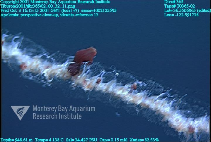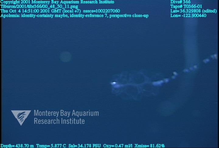 These select images are representative highlights from our Video Annotation and Reference System (VARS) database. Identifications may be subject to change as observational techniques improve over time; consequently, the overlay information may be outdated until reprocessing of images can occur. More information: Data Use and Citation.